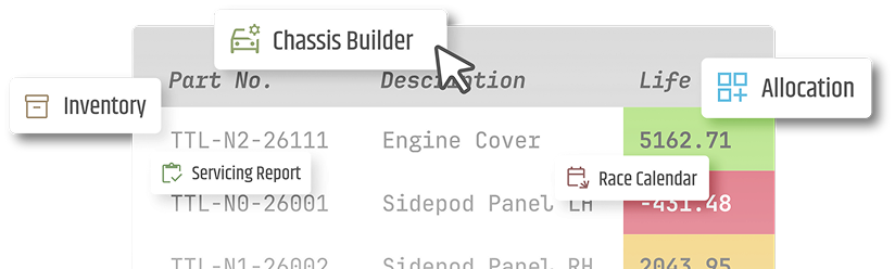 Track vehicle components across their lifecycle. LifeCheck gives teams the insight needed to maximise reliability, optimise part inventory, and race with confidence.